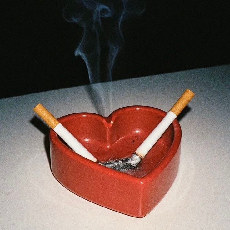 The cigarette becomes less about smoke and more about proximity, risk, wanting to be seen and undone at the same time.
